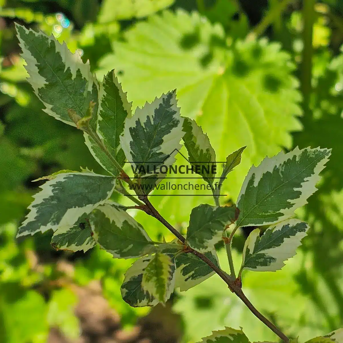 • Gros plan sur le feuillage vert bordé de blanc du BETULA nigra 'Shiloh Splash'