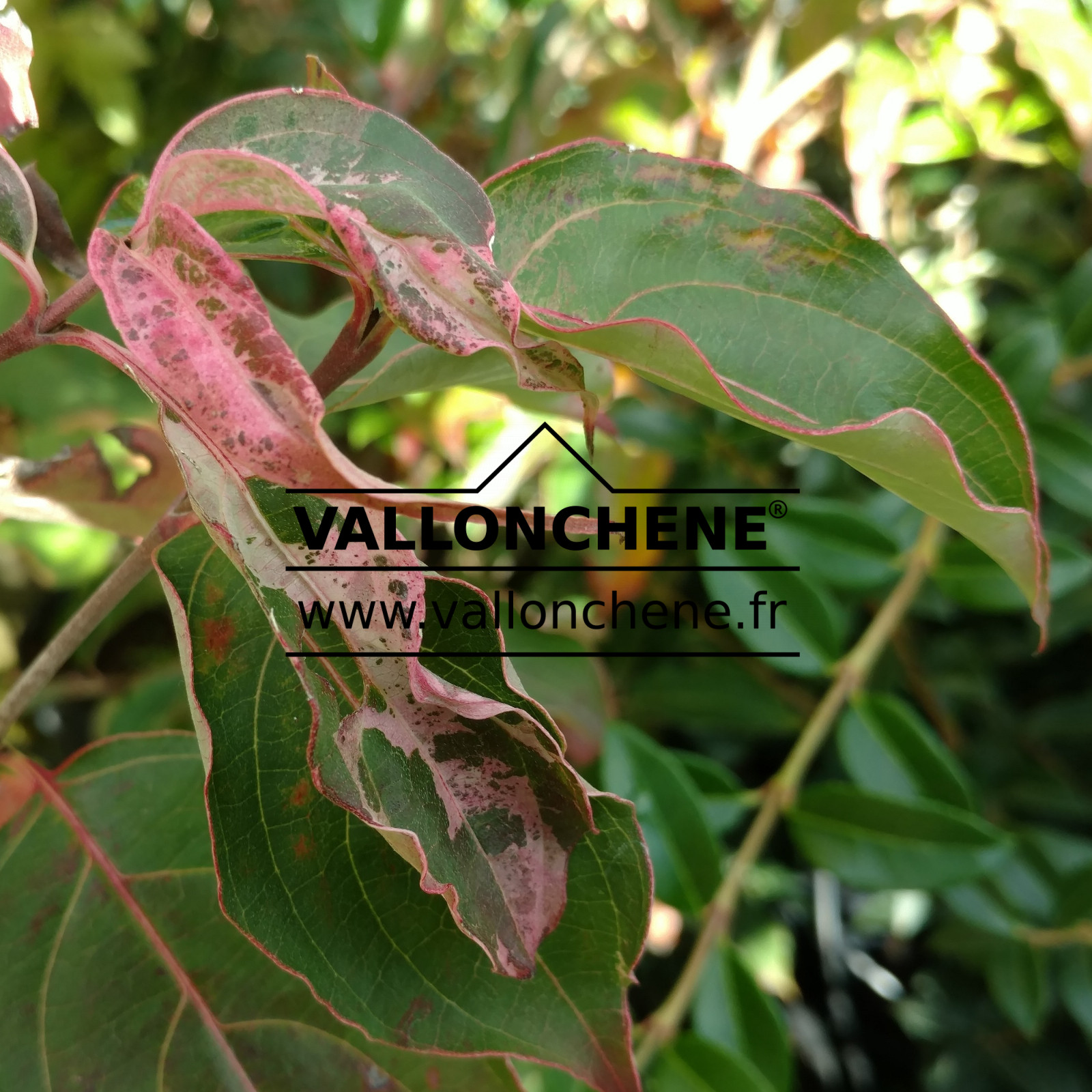 Ce cornouiller du Japon se distingue par ses jolies panachures de blanc, rose et vert. Le CORNUS kousa ‘Bultinck’s Beauty’ fleurit blanc.